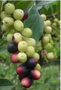 Kuipplant met grijze bast en leerachtig, glanzend blad. Mannelijke bloemen zijn geel; vrouwelijke rood en puntig. Het fruit is paars/zwart en eetbaar.