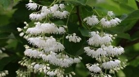 Struik met aromatische schors en grote pluimen vol kleine, lekker ruikende, witte bloemetjes