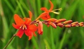 Fabulous flaming red-orange flowers add a spark of fire to the back of any border or bed in Summer! Blooms are big and tightly spaced, perfect for dramatic floral arrangements and attracting hummingbirds. Deep green, narrow, attractive foliage. This South African native spreads via corms.