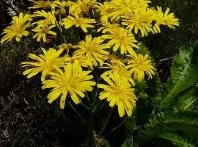 Description: Fleshy, strongly serrated leaves. From those grow hairless stems with clusters of yellow flowers.