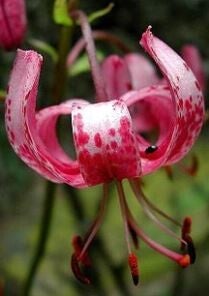 Bloemen hebben kenmerkende, teruggeslagen bloembladen. Dieprose met zwarte stippen. Hoogte wordt bepaald door de standplaats.