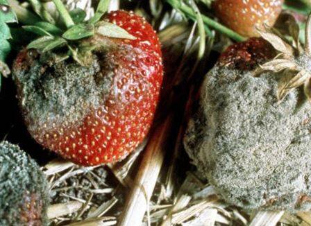 Een pluizige, grijze schimmel verschijnt en laat bij aanraking miljoenen sporen vrij. Grauwe schimmel wordt vaak gevonden op verkleurde gedeelten van de plant, zoals op verwelkte bladeren en bloemen of op beschadigde gedeeltes van de stengel. De laatste worden dan bruinzwart en worden zacht. Ook houtachtig materiaal kan worden aangetast. Helaas is de schimmel dan moeilijker te zien. Het regelmatig weghalen van verdorde en verlepte bloemen en bladeren en het regelmatig oogsten van vruchten voorkomt de schimmel. Mocht deze toch verschijnen, haal het aangetaste materiaal dan snel weg en gooi het in de vuilnisbak.