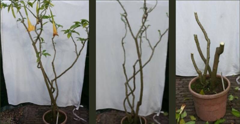 Brugmansia sanguina, die wat warmer moet overwinteren, wordt minimaal gesnoeid. Alleen kruisende takken worden verwijderd en in het voorjaar evtueel de ingestorven delen.