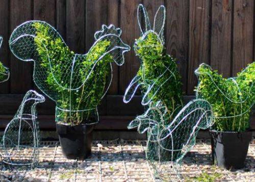 Wie niet het geduld heeft om een aantal jaren te wachten tot de gewenste vorm is bereikt maar er niet de kapitalen voor overheeft die nodig zijn om een kant-en-klaar exemplaar aan te schaffen, kan gebruik maken van draadvormen en klimop. Ook deze planten moeten worden gesnoeid, maar op deze manier ben je binnen een jaar klaar.