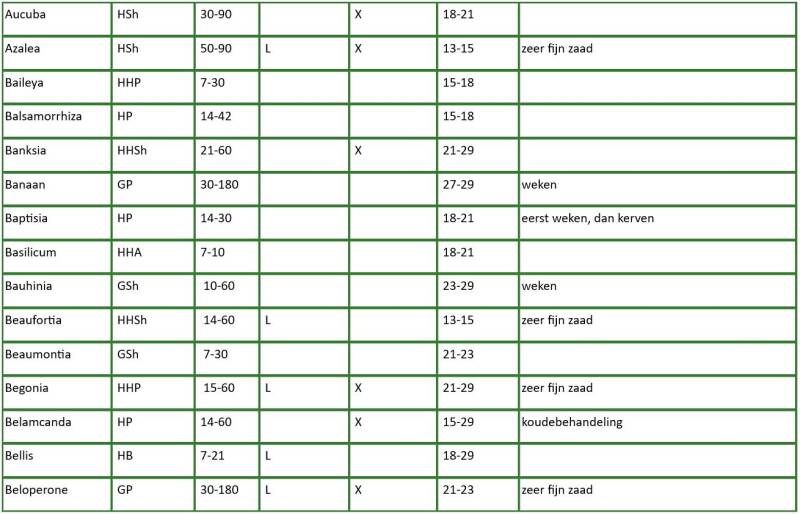 Hieronder tref je een overzicht aan van welke zaden op welke manier het beste kunnen worden gezaaid. Let wel: dit zijn richtlijnen, geen voorschriften. In deze lijst worden termen en afkortingen gehanteerd die wel enige uitleg behoeven.
